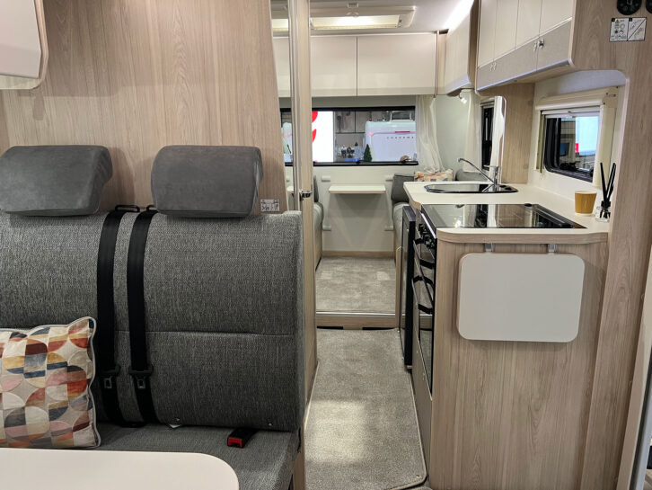 Appearing at the manufacturer’s NEC stand are the GT115 (2-berth), GT185 (4-berth) and GT196 (6-berth), all of which featured the upgrades of the Evolve option. Each has a MTPLM of 3,500kg. The GT115 offers an end kitchen with adjacent washroom and spacious parallel lounge which converts to a double bed.